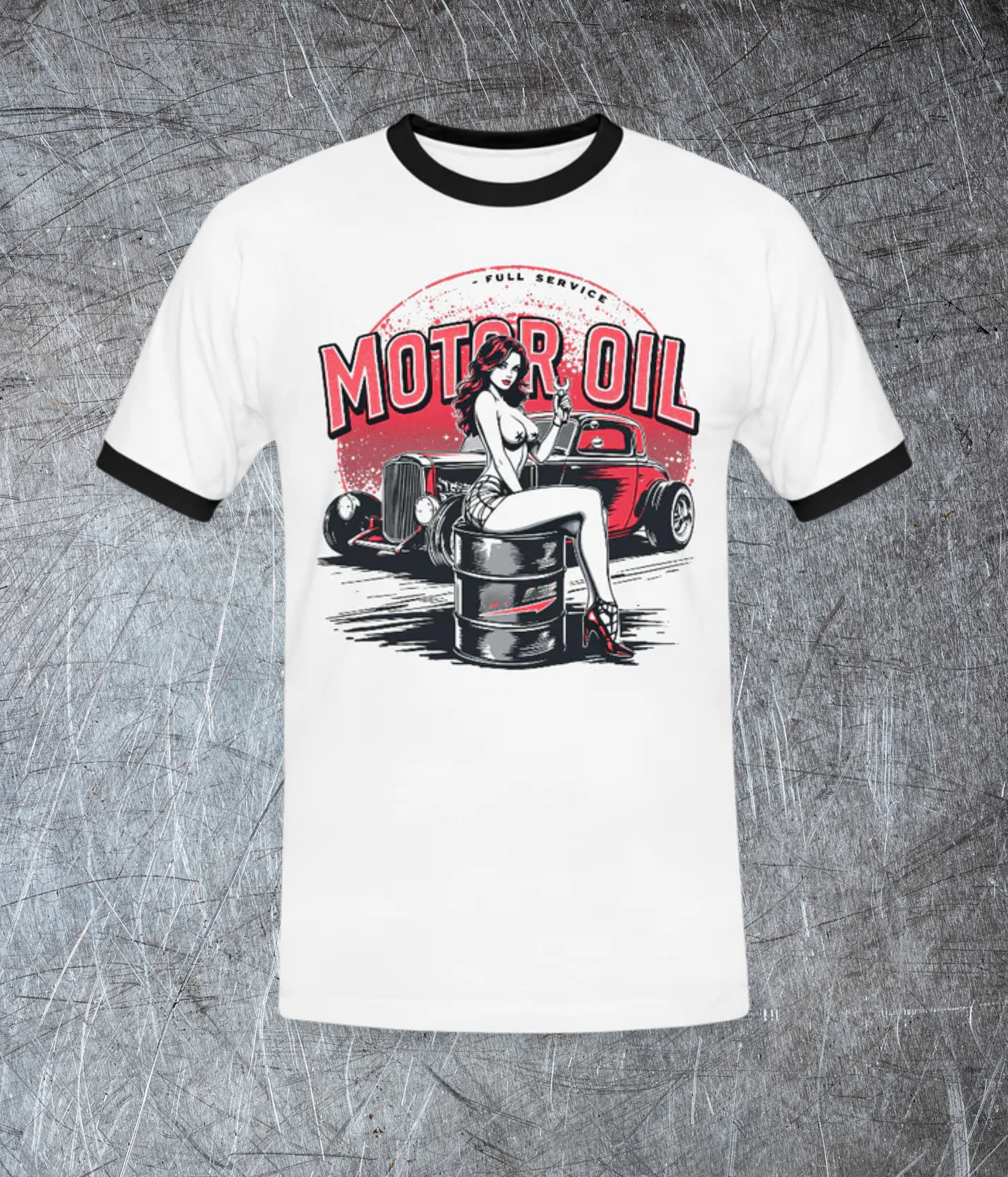 Dieses Rock'n'Roll-Garagenmotiv bringt Retro-Charme, Hot Rod und Pin-Up-Power in einem Shirt zusammen.